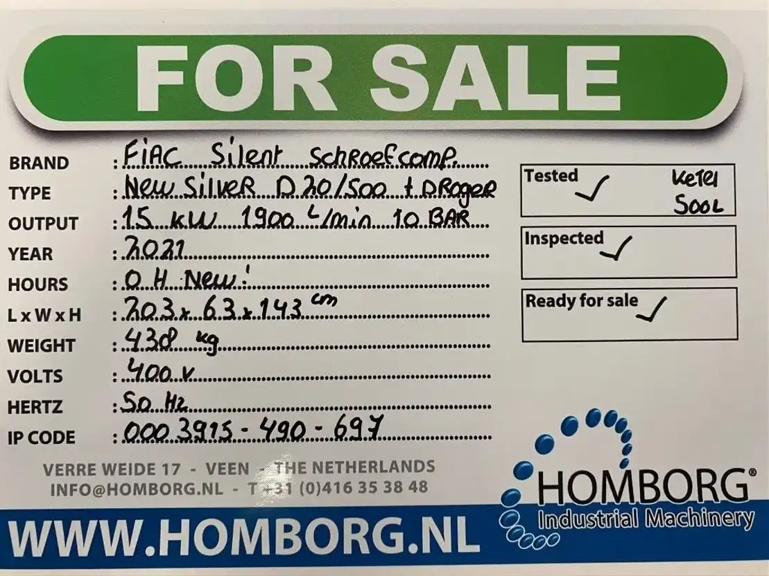 FIAC New Silver D 20 / 500 Silent 15 kW 1900 L / min 10 Bar Elektrische Schroefcompressor met ketel en droger